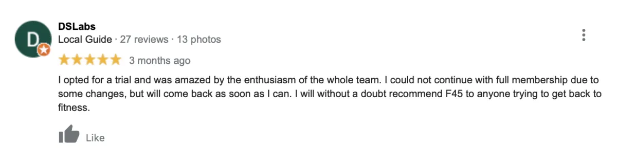 Whatever your level of fitness - whether you're a frequent gym bunny or complete fitness newbie, F45 was designed to get you RESULTS! And you'll leave every visit with a smile on your face!